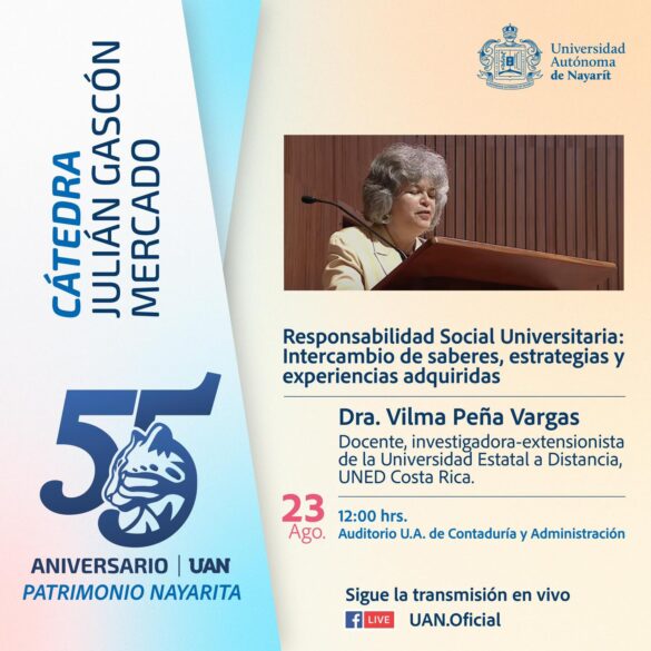¡En el marco de los festejos del 55 Aniversario de la Universidad Autónoma de Nayarit (UAN), te invitamos a la Cátedra Julián Gascón Mercado “Responsabilidad Social Universitaria: Intercambio de saberes, estrategias y experiencias adquiridas”, que impartirá la Dra. Vilma Peña Vargas Docente, investigadora-extensionista de la Universidad Estatal a Distancia, UNED Costa Rica.