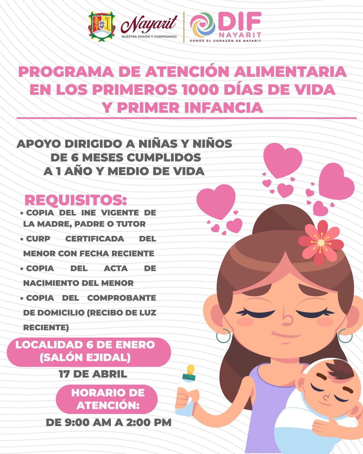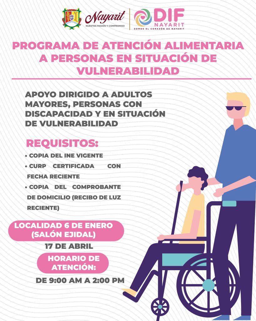 NayaritPolítica Beatriz Estrada y el Corazón de Nayarit ponen a disposición de la ciudadanía los programas de Atención Alimentaria, dirigidos a la primera infancia y a personas en situación de vulnerabilidad, con el objetivo de fortalecer su nutrición y bienestar. by Héctor Guzmán abril 17, 2026 by Héctor Guzmán abril 17, 2026 5 ✍ Jornada de inscripción 17 de abril 📍 Localidad 6 de Enero (Salón Ejidal) 🕛 De 9 a.m. a 2 p.m. Consulta los requisitos y accede a estos apoyos. Para el Sistema DIF Nayarit, la alimentación es una prioridad. 0 comment 0 FacebookTwitterWhatsappTelegramEmail Héctor Guzmán previous post 🎤 ¿Listo para alzar la voz?Nayarit te espera. next post Gobierno de Nayarit invita a vivir el Gran Fondo Riviera Nayarit 2026 Artículos relacionados 🎉💃 ¡Así se vivió la clausura del Festival... abril 24, 2026 Reconoce Beatriz Estrada a educadoras y educadores nayaritas,... abril 24, 2026 El gobernador del estado, Miguel Ángel Navarro Quintero,... abril 24, 2026