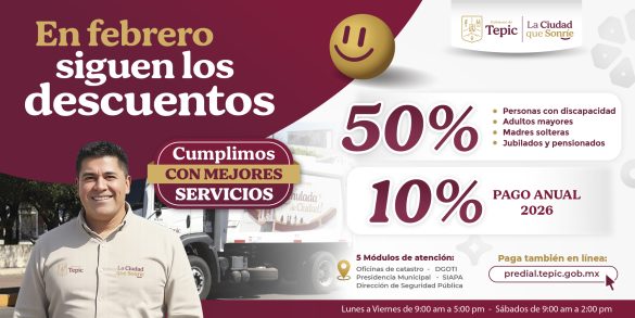 NayaritPolítica Continúan Descuentos de Predial en Tepic durante todo Febrero by Héctor Guzmán febrero 11, 2026 by Héctor Guzmán febrero 11, 2026 2 CompartirTwittear0 Compartir 0 comment 0 FacebookTwitterWhatsappTelegramEmail Héctor Guzmán previous post BODAS COLECTIVAS 2026 next post Expo Amor, Amistad y Sonrisas Artículos relacionados Continúan los descuentos en Predial en Tepic durante... febrero 11, 2026 Acta de Matrimonio Bodas Colectivas 2026 febrero 11, 2026 Bodas Colectivas 2026 febrero 11, 2026 Leave a Comment Cancel Reply Save my name, email, and website in this browser for the next time I comment. Δ