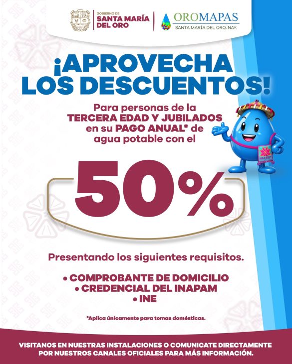 El H. XLIII Ayuntamiento de Santa María del Oro, a través del organismo operador Oromapas Santa María del Oro informa a la ciudadanía que el Cabildo Municipal ha autorizado descuentos especiales para el ejercicio 2026 en los pagos del servicio de agua potable.