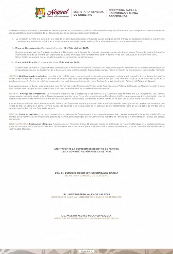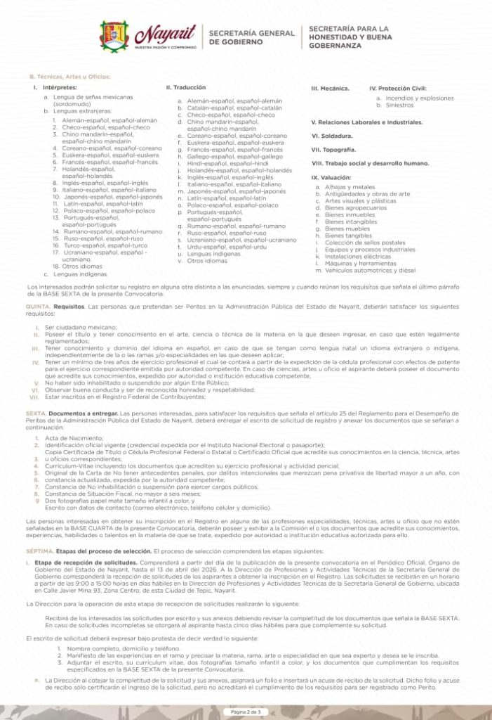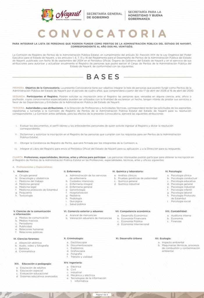 Si cuentas con experiencia en alguna ciencia, arte, oficio o profesión, esta es tu oportunidad de formar parte de la lista de personas que podrán fungir como Peritos de la Administración Pública del Estado de Nayarit para el periodo 2026–2030.
