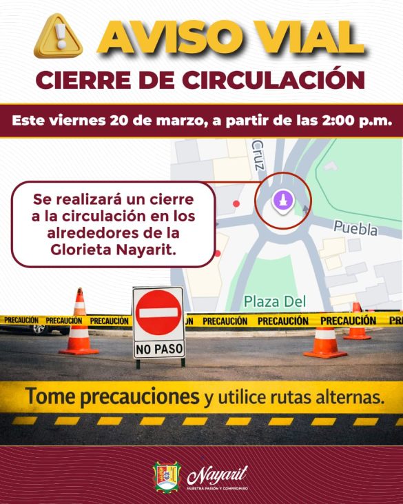 NayaritPolítica El Gobierno del Estado de Nayarit informa que este viernes 20 de marzo, a partir de las 14:00 horas, se realizará el cierre a la circulación vial, en la Glorieta Nayarit, derivado de un evento cultural de los pueblos originarios. by Héctor Guzmán marzo 20, 2026 by Héctor Guzmán marzo 20, 2026 3 Durante la actividad se llevarán a cabo presentaciones artísticas, así como exposición y venta de artesanías y gastronomía local. El Gobierno del Estado exhorta a la ciudadanía a tomar precauciones y utilizar rutas alternas. 0 comment 0 FacebookTwitterWhatsappTelegramEmail Héctor Guzmán previous post Presenta Miguel Ángel Navarro el Fondo Soberano Nuevo Nayarit para fortalecer las finanzas y atraer inversión next post 🔥 Continúan los trabajos de combate al incendio forestal en La Cruz de Huanacaxtle Artículos relacionados Beatriz Estrada impulsa la educación con espacios más... marzo 20, 2026 Respalda Miguel Ángel Navarro visión de responsabilidad presupuestaria... marzo 20, 2026 El gobernador del estado, Miguel Ángel Navarro Quintero,... marzo 20, 2026 Leave a Comment Cancel Reply Save my name, email, and website in this browser for the next time I comment.