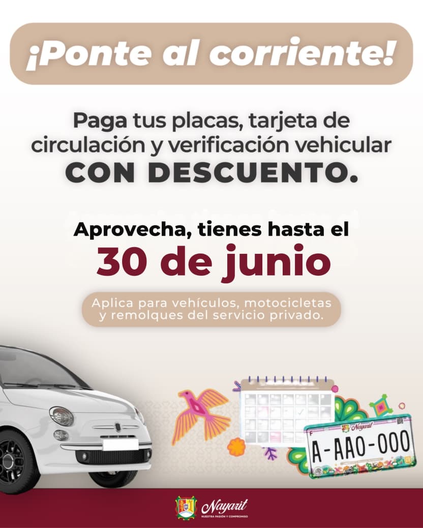 El Gobierno del Estado de Nayarit invita a la ciudadanía a aprovechar los beneficios vigentes para el pago de placas, tarjeta de circulación y verificación vehicular con descuento, disponibles hasta el 30 de junio, como parte de las acciones para apoyar la economía familiar y facilitar la regularización de estos trámites.