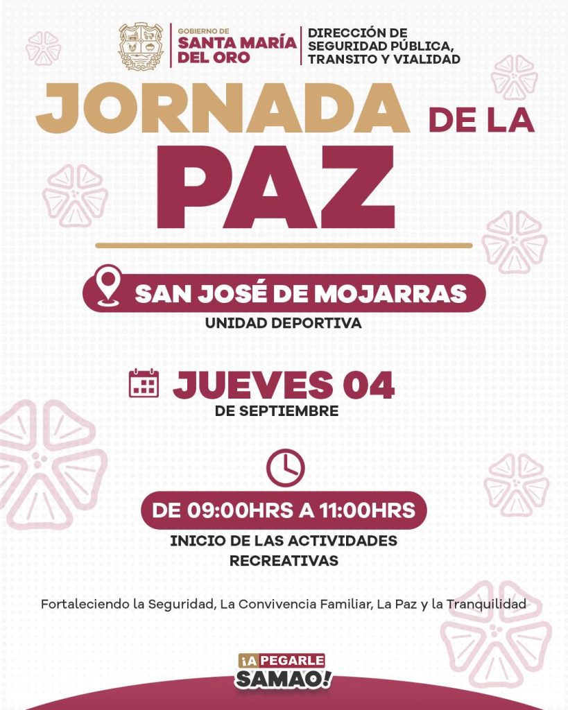 El H. XLIII Ayuntamiento de Santa María del Oro, encabezado por el presidente municipal M.C.V.Z. Rodrigo Polanco Sojo, invita a toda la ciudadanía a participar en la Jornada de La Paz.