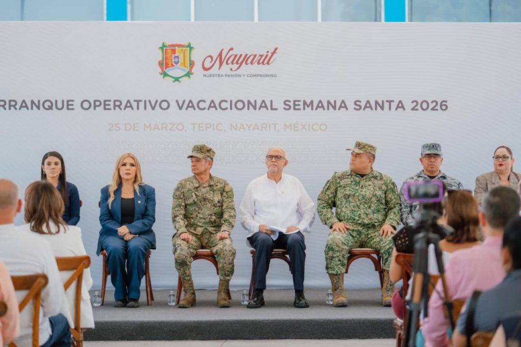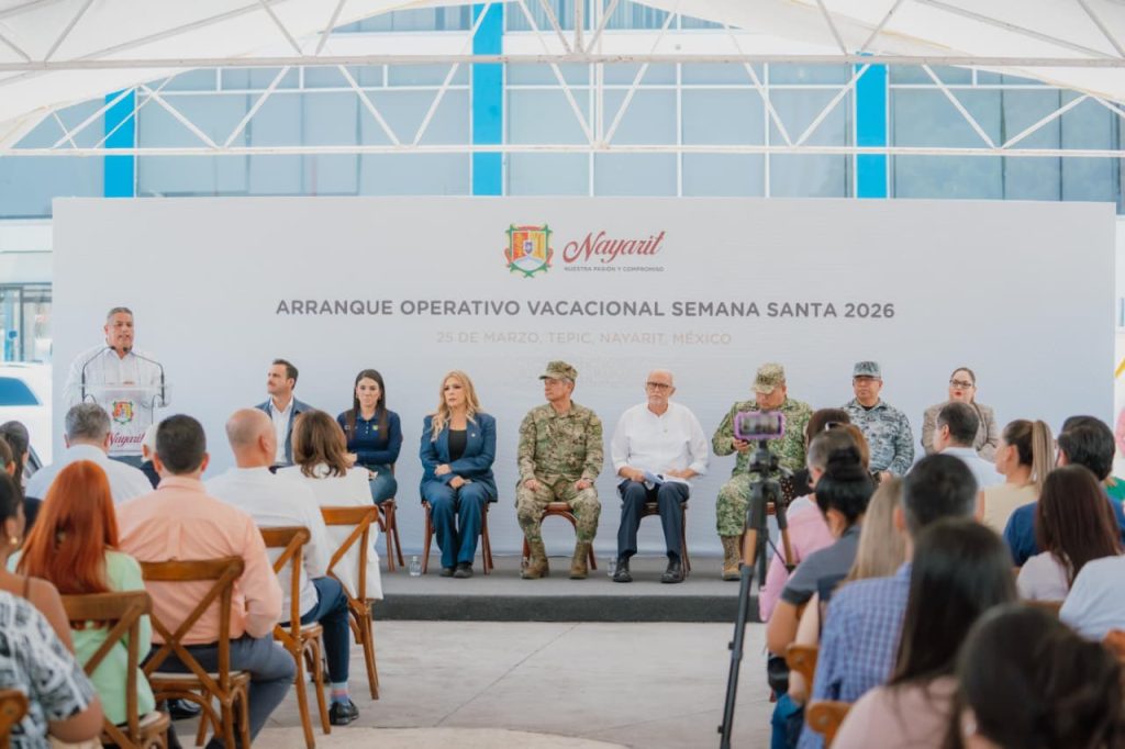 El gobernador del estado, Miguel Ángel Navarro Quintero, dio el banderazo de inicio del Operativo Vacacional Semana Santa 2026 en la explanada del Exconvento de la Cruz, en Tepic, acompañado de su esposa, la doctora Beatriz Estrada Martínez, presidenta del Sistema DIF Nayarit, así como de autoridades de los tres órdenes de gobierno.