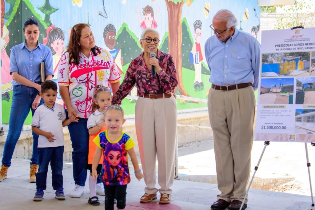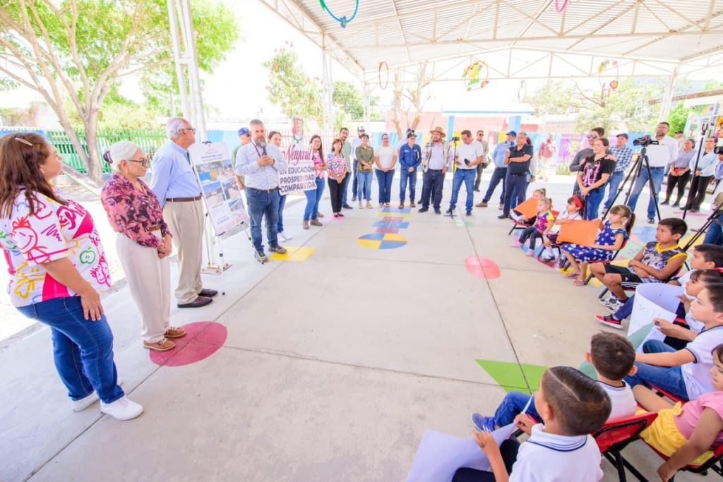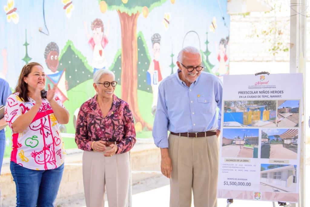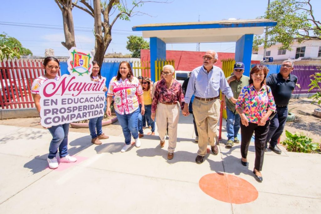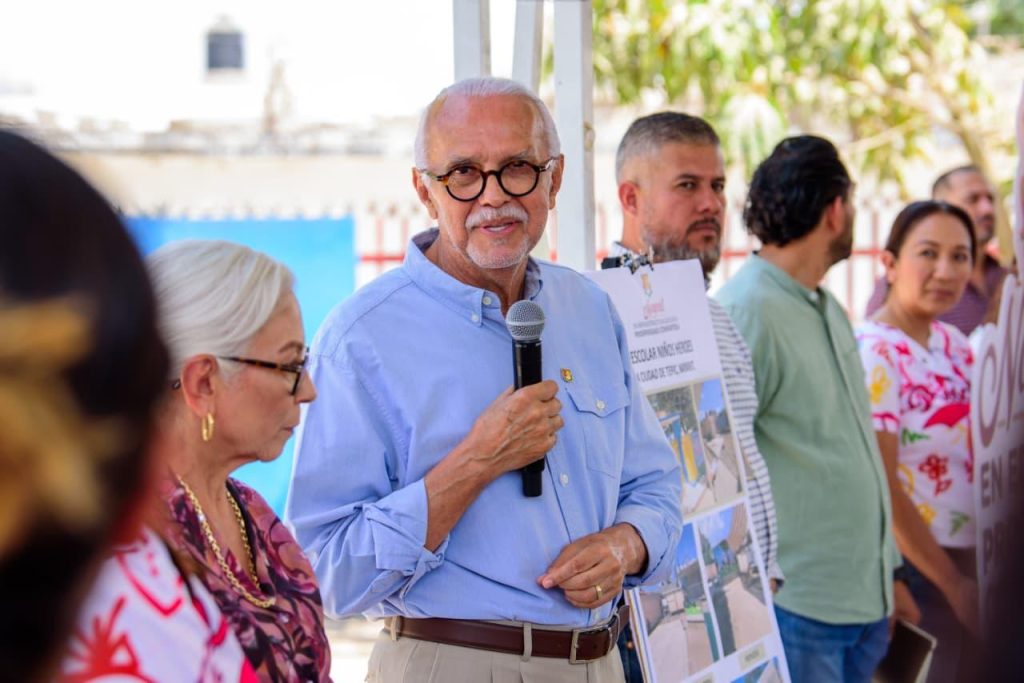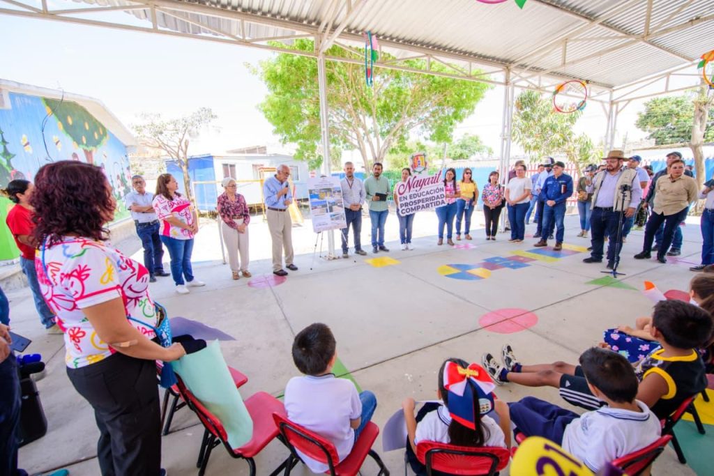 El gobernador del estado, Miguel Ángel Navarro Quintero, dio inicio a obras en el preescolar Niños Héroes, en Tepic, con el objetivo de que las niñas y los niños cuenten con mejores espacios para aprender, jugar y recibir sus alimentos.