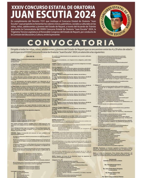 La #XXXIIILegislatura convoca a todas las niñas, niños y jóvenes del Estado de Nayarit de entre los 4 y 29 años de edad a participar en el XXXIV Concurso Estatal de Oratoria “Juan Escutia” 2024.